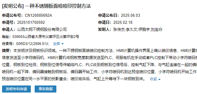 2025年6月3日,山西太鋼不銹鋼股份有限公司成功申請一項名為“一種不銹鋼板面噴噴印控制方法”專利,申請公布號為CN120085692A,申請日期為2025年2月18日。